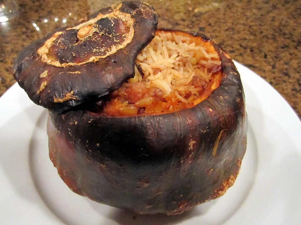 Often prepared around Christmastime, ghapama is a stuffed pumpkin dish. The guts of the pumpkin are removed, and then it is stuffed with boiled rice and dried fruits like apple, apricot, dates, plums, and raisins together with nuts. The pumpkin is baked until it softens.